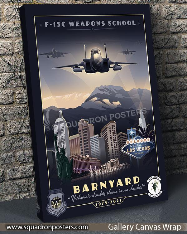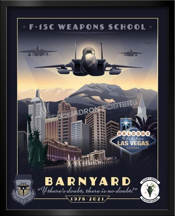 The Weapons School Ethos is: “Humble, Credible, Approachable”. The squadron name is “Satan’s Angels”. The squadron has been training F-15C Weapons Officers since 1978 and has produced a total of 511 F-15C Weapons Officer Graduates The F-15C division of the 433rd WPS will be closing on 10 December 2021. This poster will be featured at the closing party for the F-15C and is meant for all of those who have flown this aircraft in this course. Yes, downtown Las Vegas is close, but the majority of the F-15C memories and tactical experiences took place over the mountainous ranges North of the City. Standard tactics involve a 4-ship of F-15Cs going supersonic in the cons.