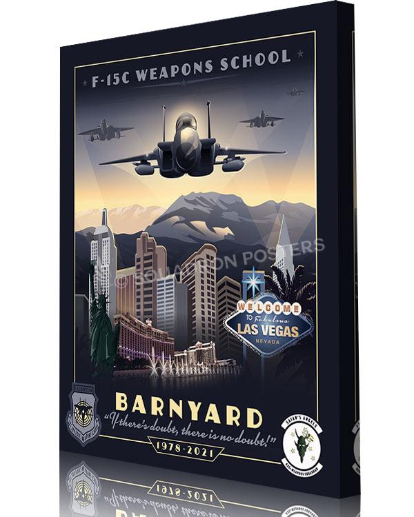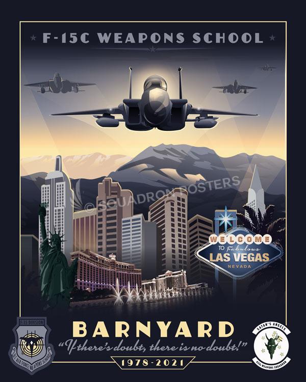 The Weapons School Ethos is: “Humble, Credible, Approachable”. The squadron name is “Satan’s Angels”. The squadron has been training F-15C Weapons Officers since 1978 and has produced a total of 511 F-15C Weapons Officer Graduates The F-15C division of the 433rd WPS will be closing on 10 December 2021. This poster will be featured at the closing party for the F-15C and is meant for all of those who have flown this aircraft in this course. Yes, downtown Las Vegas is close, but the majority of the F-15C memories and tactical experiences took place over the mountainous ranges North of the City. Standard tactics involve a 4-ship of F-15Cs going supersonic in the cons.