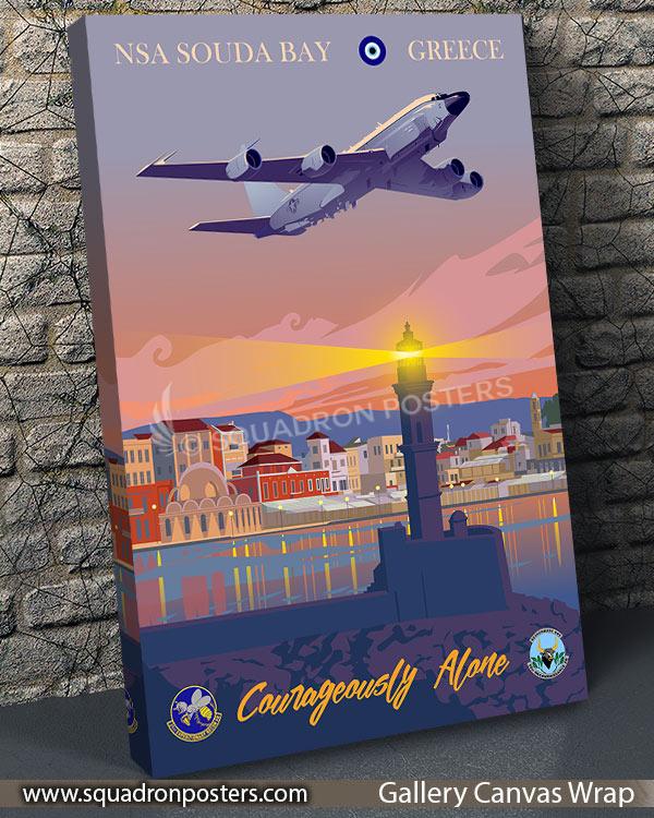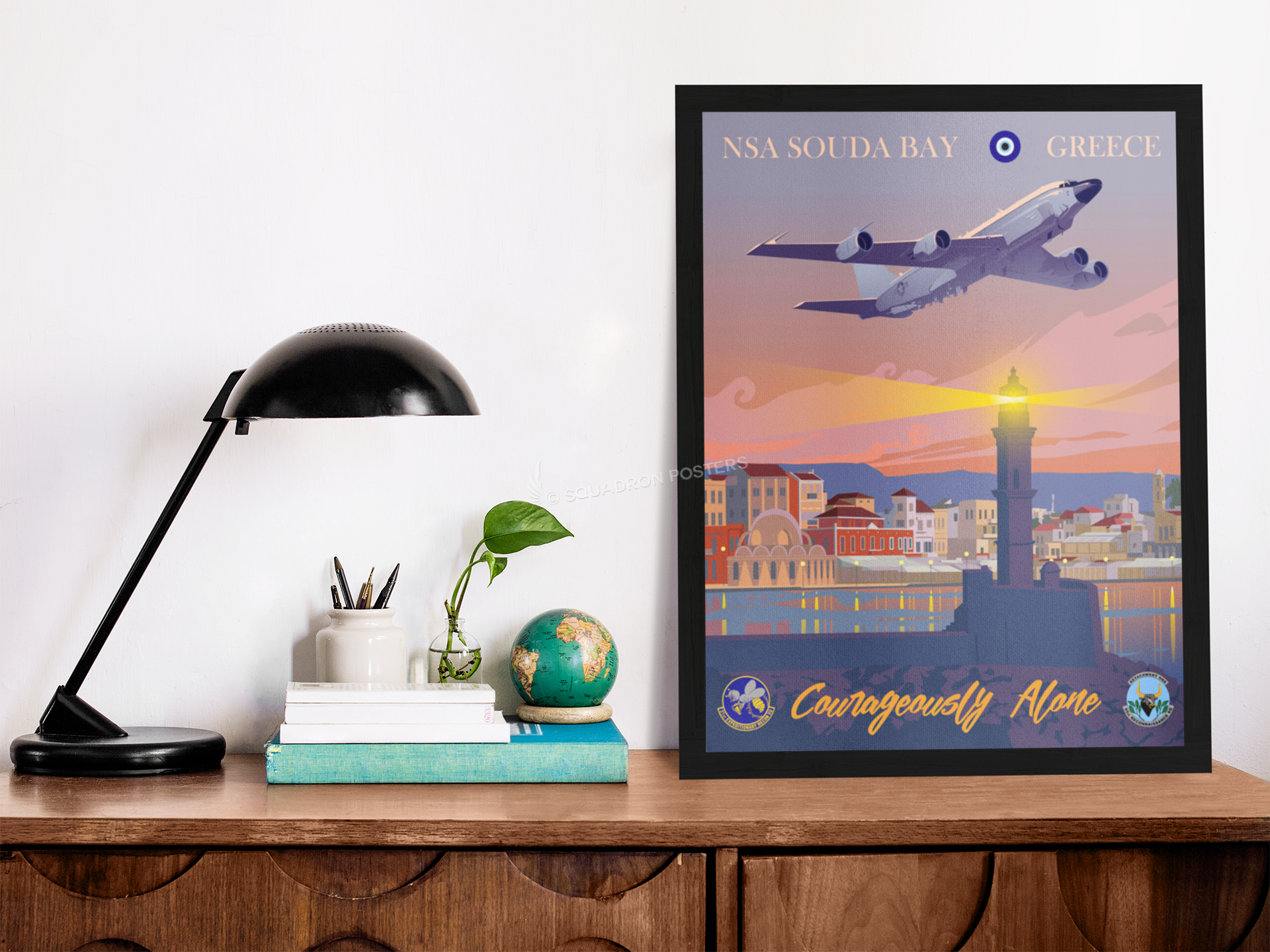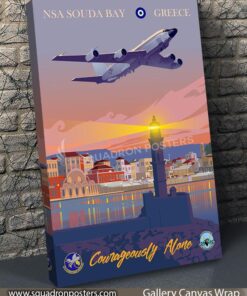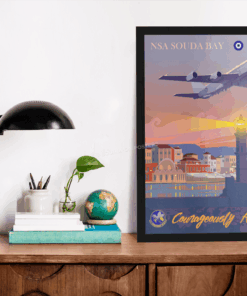 Nestled on the island of Crete sits Crete Naval Base, formally known in NATO as Naval Support Activity, Souda Bay (NSA-Souda Bay), which serves as a vital logistics and operational hub for U.S. and allied forces in the European, African, and Central theaters. Its strategic location enables rapid power projection and sustained support for Air Force, Navy, and Joint units, facilitating critical contingency operations and multinational cooperation. From providing essential logistical and maintenance support to hosting ISR and combat operations, NSA Souda Bay remains an indispensable asset in maintaining regional stability and mission readiness. This artwork pays tribute to the significance of NSA Souda Bay, honoring its role in global operations and its unwavering commitment to supporting U.S. and allied forces.