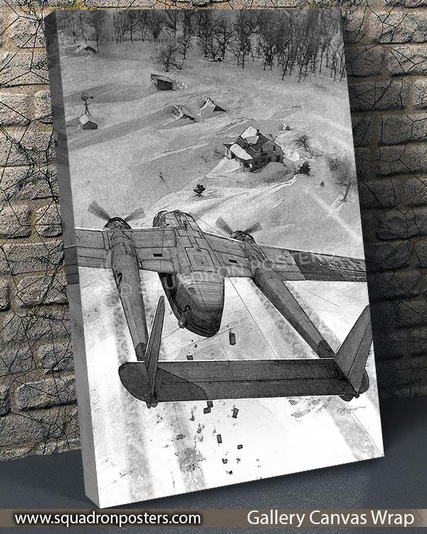 This painting portrays Civil Air Patrol members of the Nebraska wing kicking hay bales out of a C-82 Flying Boxcar to starving cattle at a snowbound ranch below. The Great Plains Blizzard of 1949 left a snow-covered swath from Arizona to Wyoming leaving 40-foot-tall drifts that lasted for months.