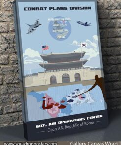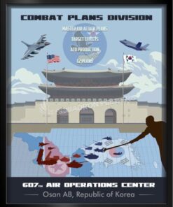 As the most forward deployed permanently based wing in the Air Force, and equipped with A-10 Thunderbolt IIs and F-16 Fighting Falcons (about 48 aircraft), the 51st Fighter Wing is charged with executing combat operations, receiving follow-on forces and defending the base from attack. As the air component to United States Forces Korea and Combined Forces Command, 7th Air Force provides the command and control structures and personnel necessary to deliver precise, persistent, combined air and space power in defense of the Republic of Korea. Check out this stunning Osan AB Korea 607th AOC Combat Plans Division Art by Squadron Posters!