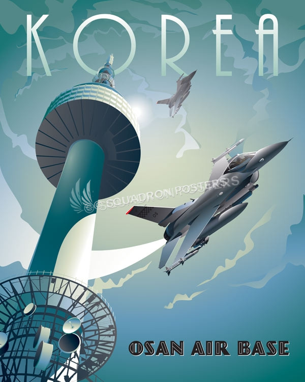 “Osan AB, Korea F-16” vintage style military aviation travel poster art by – Squadron Posters!