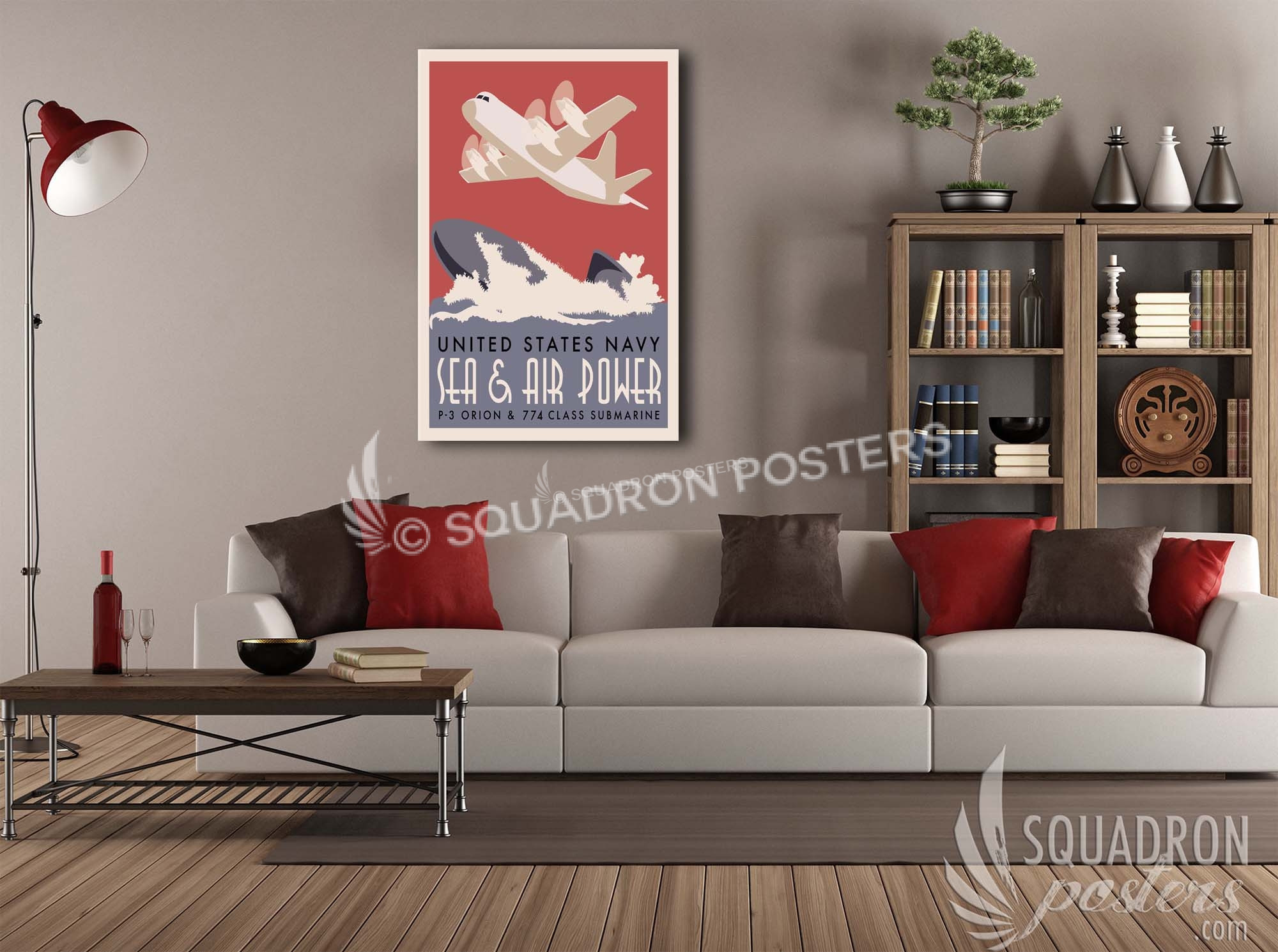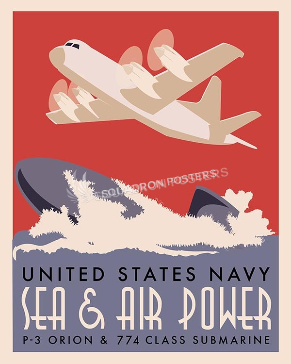 This classic vintage style military aviation travel poster “P3-Orion and Sub SSN-774” is dedicated to all those who flew, maintained or supported the P3-Orion or Submarine class SSN-774. The Lockheed P-3 Orion is a four-engine turboprop anti-submarine and maritime surveillance aircraft developed for the United States Navy and introduced in the 1960s. Lockheed based it on the L-188 Electra commercial airliner. The aircraft is easily distinguished from the Electra by its distinctive tail stinger or “MAD Boom”, used for the magnetic detection of submarines. The Virginia class, also known as the SSN-774 class, is a class of nuclear-powered fast attack submarines (hull classification symbol SSN) in service with the United States Navy.