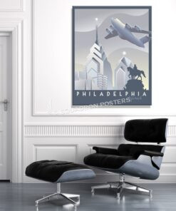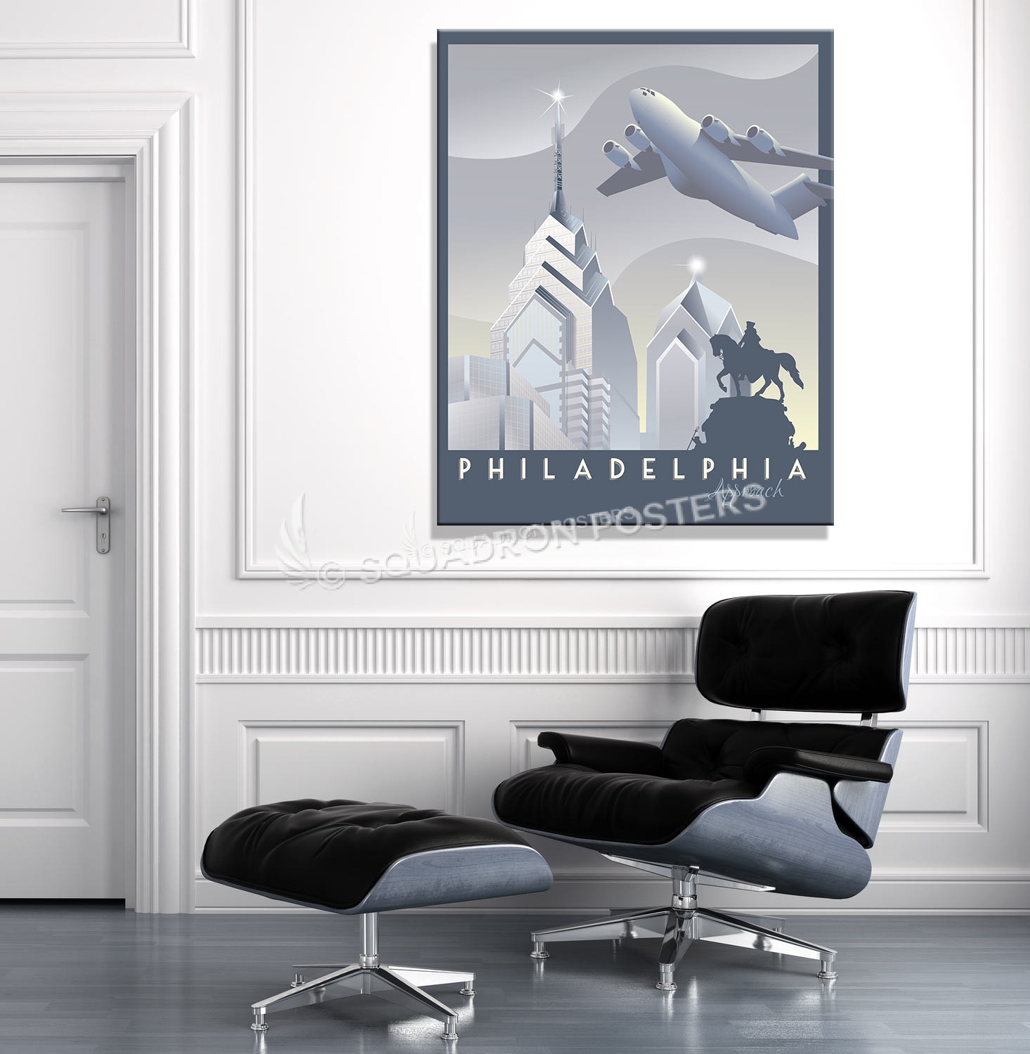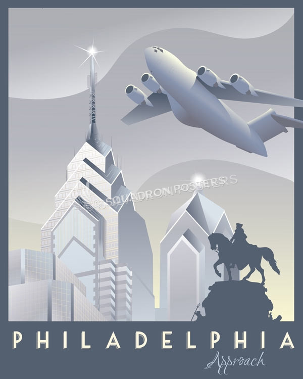 This art represents the Downtown Philadelphia skyline approach with a C-17 Globemaster III.