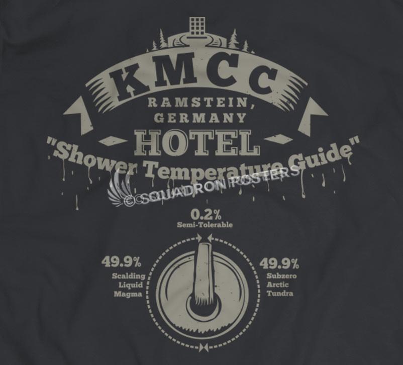 Anyone who has passed through Ramstein and used the showers at KMC Military Lodging can appreciate this T-shirt. “Shower Temperature Guide” : 49% Scalding Liquid Magma – 0.2% Semi-Tolerable – 49.9% Subzero Arctic Tundra!