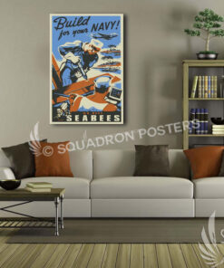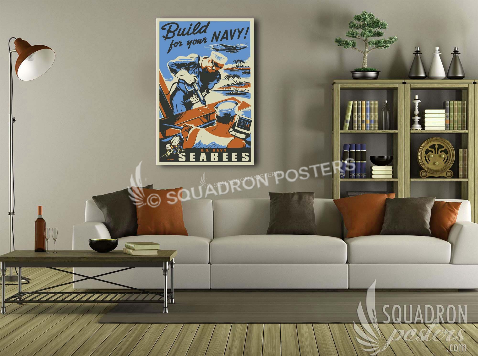 This art deco style military naval travel poster “Seabees – Build for your Navy”, is an *updated modern version of the original United States Navy Seabees recruiting & enlistment poster (circa 1940-1950) created by Robert Muchley. This artwork is dedicated to all the hard working SeaBees of the United States Navy. ***The SeaBees depicted in this art are bulked up more than the original art as well as the presence of an Navy EA-6B Prowler flying overhead, a modern Hammer Drill and a Toughbook computer. A “Seabee” is a member of the United States Naval Mobile Construction Battalion (CB). The word “Seabee” comes from initials “CB”. The Seabees have a history of building bases, bulldozing and paving thousands of miles of roadway and airstrips, and accomplishing a myriad of other construction projects in a wide variety of military theaters dating back to World War II.