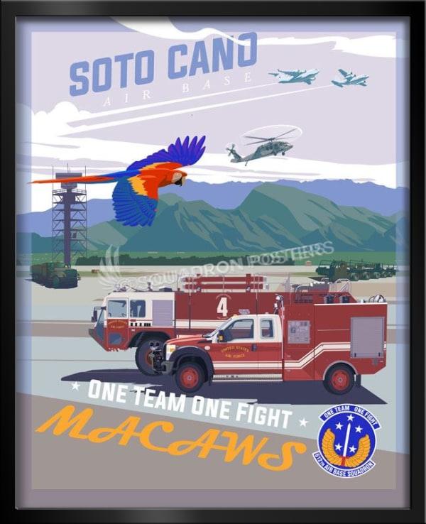 Soto Cano Air Base is a Honduran military base 5 mi to the south of Comayagua in Honduras. It houses 1,200–1,500 U.S. troops and is also used by the Honduran Air Force academy. The airbase became operational in 1940, changing the old location of the Honduras Air Force Academy in Toncontin, Tegucigalpa to Palmerola. It serves as one of the important bases to the US Military’s presence in Central America. Soto Cano AB 612th ABS “Macaws” Art by – Squadron Posters!