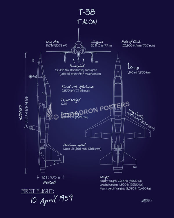 T-38 Talon Blueprint Art vintage style military aviation travel poster art by – Squadron Posters!