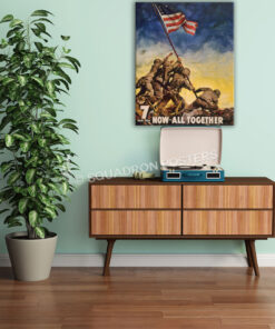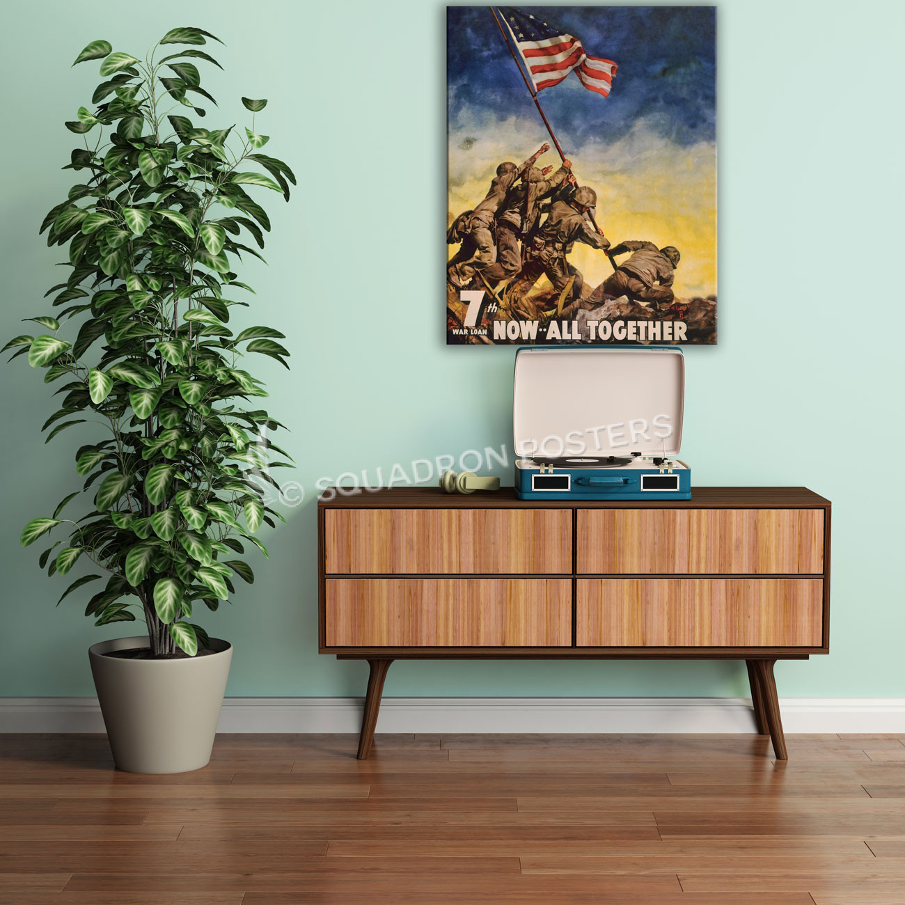 This vintage poster art represents one of the most striking images in American history, the U.S. Marines raising the American flag on Iwo Jima. The original image was captured on film by Joe Rosenthal and on canvas by C.C. Beall. The original photo became the image for the 7th War Bond drive and was featured on, posters, billboards and even stamps. The image speaks to the resilience of the American people, triumphing over adversity and succeeding in the face of insurmountable odds. War bonds are debt securities issued by a government to finance military operations and other expenditure in times of war.
