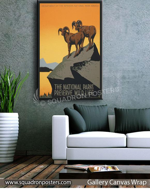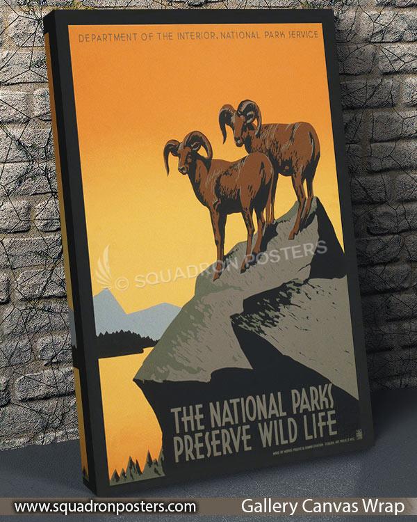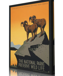 The original Poster for National Park Service promoting travel to national parks, showing two bighorn sheep, was commissioned by the Works Progress Administration Federal Art Project between 1936 and 1939.