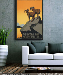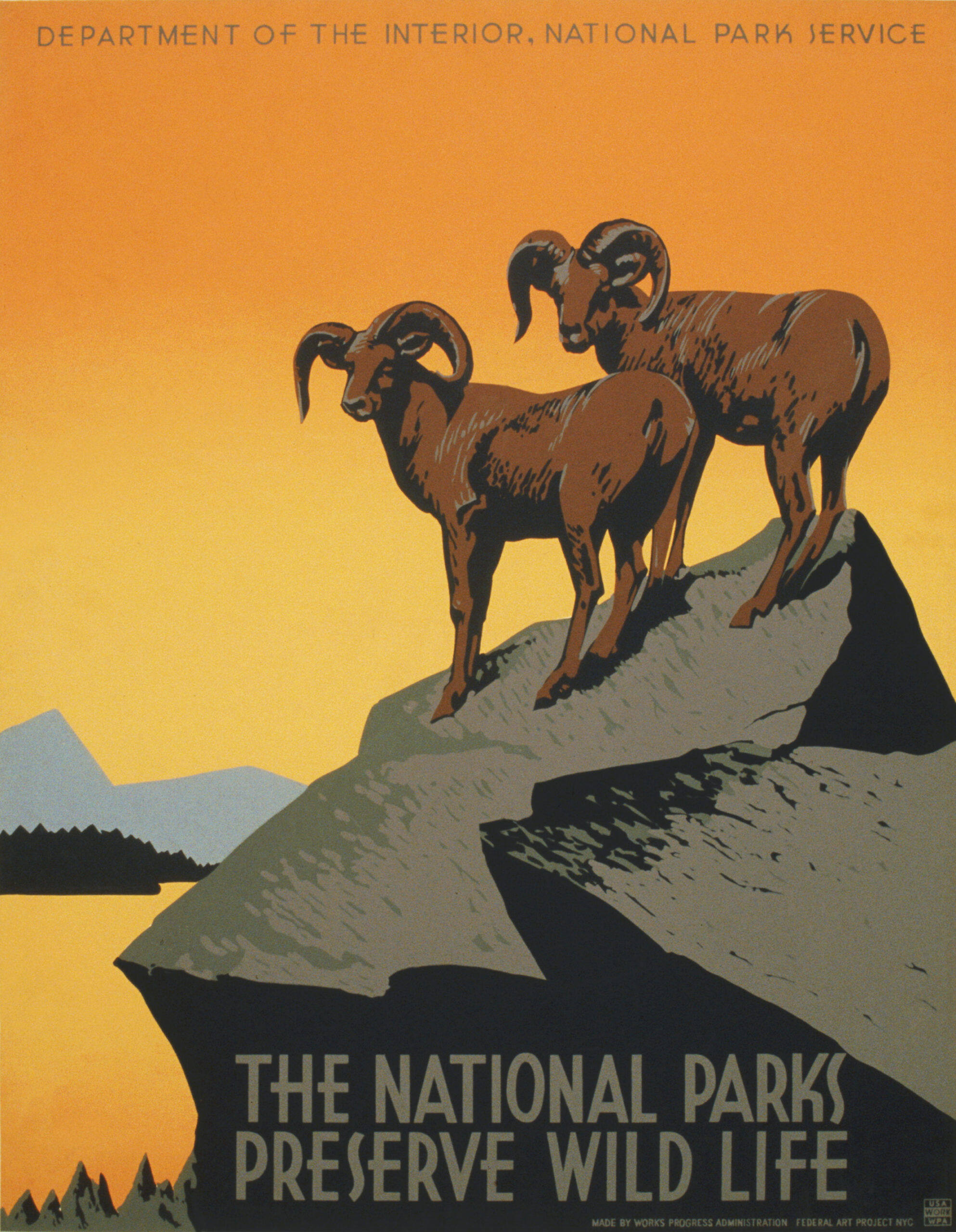 The original Poster for National Park Service promoting travel to national parks, showing two bighorn sheep, was commissioned by the Works Progress Administration Federal Art Project between 1936 and 1939.