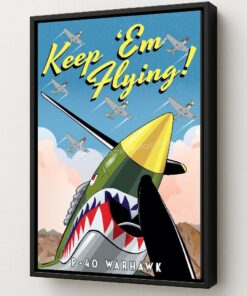 P-40 Warhawk was the name the United States Army Air Corps gave the plane, and after June 1941, the USAAF adopted the name for all models, making it the official name in the US for all P-40s. The British Commonwealth and Soviet air forces used the name Tomahawk for models equivalent to the original P-40, P-40B, and P-40C, and the name Kittyhawk for models equivalent to the P-40D and all later variants. P-40s first saw combat with the British Commonwealth squadrons of the Desert Air Force in the Middle East and North African campaigns, during June 1941. No. 112 Squadron Royal Air Force, was among the first to operate Tomahawks in North Africa and the unit was the first Allied military aviation unit to feature the “shark mouth” logo, copying similar markings on some Luftwaffe Messerschmitt Bf 110 twin-engine fighters. Check out this stunning Through the Ages P-40 Warhawk Art by Squadron Posters!