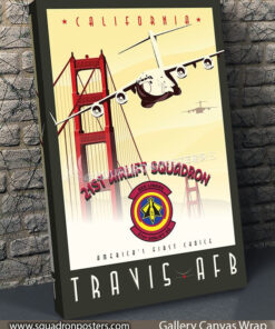This artwork features the Golden Gate Bridge in downtown San Francisco, California. A C-17 Globemaster, C-130 Hercules, and a KC-135 Stratotanker are on approach into Travis Air Force Base. The 21st Airlift Squadron is part of the 60th Air Mobility Wing at Travis AFB, California. It operates the C-17A Globemaster III supporting the United States Air Force global reach mission world wide. The squadron was originally a C-5 unit but parted from that airframe in 2005. The squadron name is the “Beeliners.”