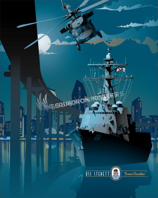 The USS Sterett (DDG-104) is a Flight IIA Arleigh Burke-class guided missile destroyer of the United States Navy. The contract to build the USS Sterett was awarded to Bath Iron Works Corporation in Bath, Maine on 13 September 2002. On 17 November 2005, her keel was laid down, and she was christened on 19 May 2007. Her commissioning took place in Baltimore, Maryland, Andrew Sterett’s birthplace, on 9 August 2008. The ship’s home port is Naval Base San Diego.