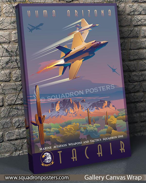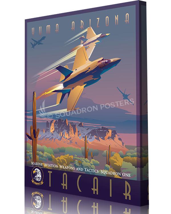 Step into the world of tactical aviation excellence with the Yuma, Arizona MAWTS-1 TACAIR Division canvas art featuring the F-35C, F-35B, F-18, and MQ-9 aircraft. This striking artwork celebrates the Marine Aviation Weapons and Tactics Squadron One’s (MAWTS-1) TACAIR Division in Yuma, Arizona, showcasing a dynamic array of cutting-edge aircraft used in modern aerial warfare. Printed on high-quality canvas, the vivid depiction of these aircraft captures the prowess and versatility of the TACAIR Division, making it an impressive addition to military installations, offices, or spaces dedicated to honoring tactical aviation training and innovation. Whether displayed by military personnel, veterans, or aviation enthusiasts, this canvas art embodies the spirit of advanced air combat training, emphasizing the pivotal role played by MAWTS-1 in shaping the future of aerial warfare.